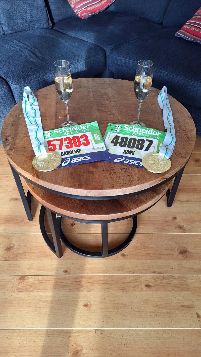 We voelden ons enorm dankbaar dat we het zo konden lopen. Heelhuids over de finish in 4:30:23. Evengoed nog een heel nette tijd voor rustig aan lopen.